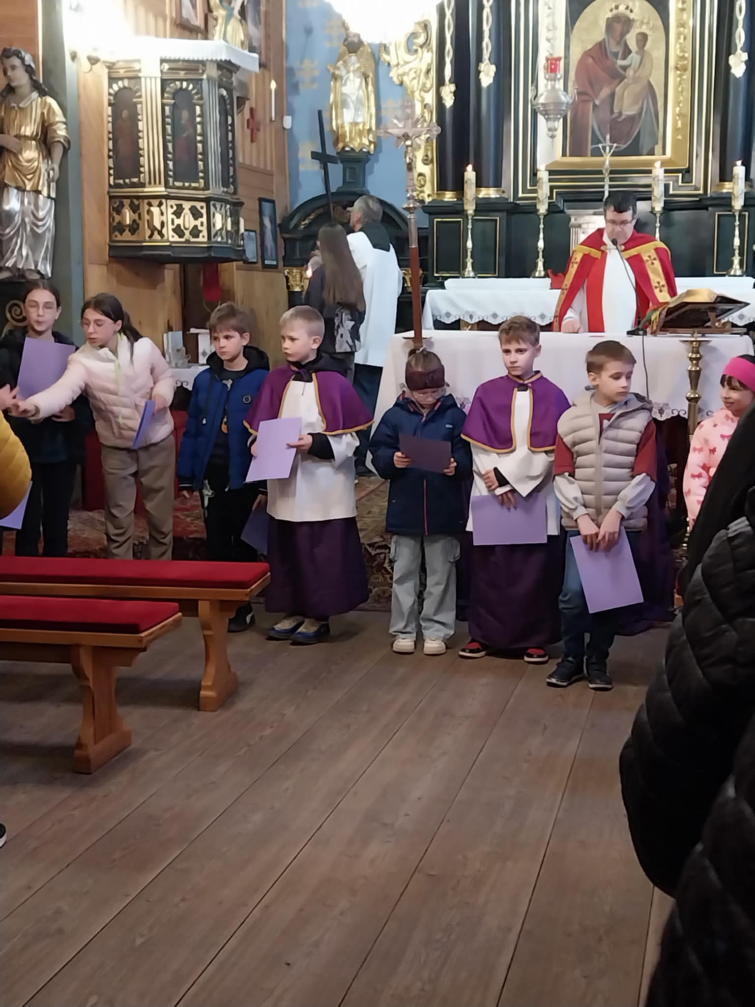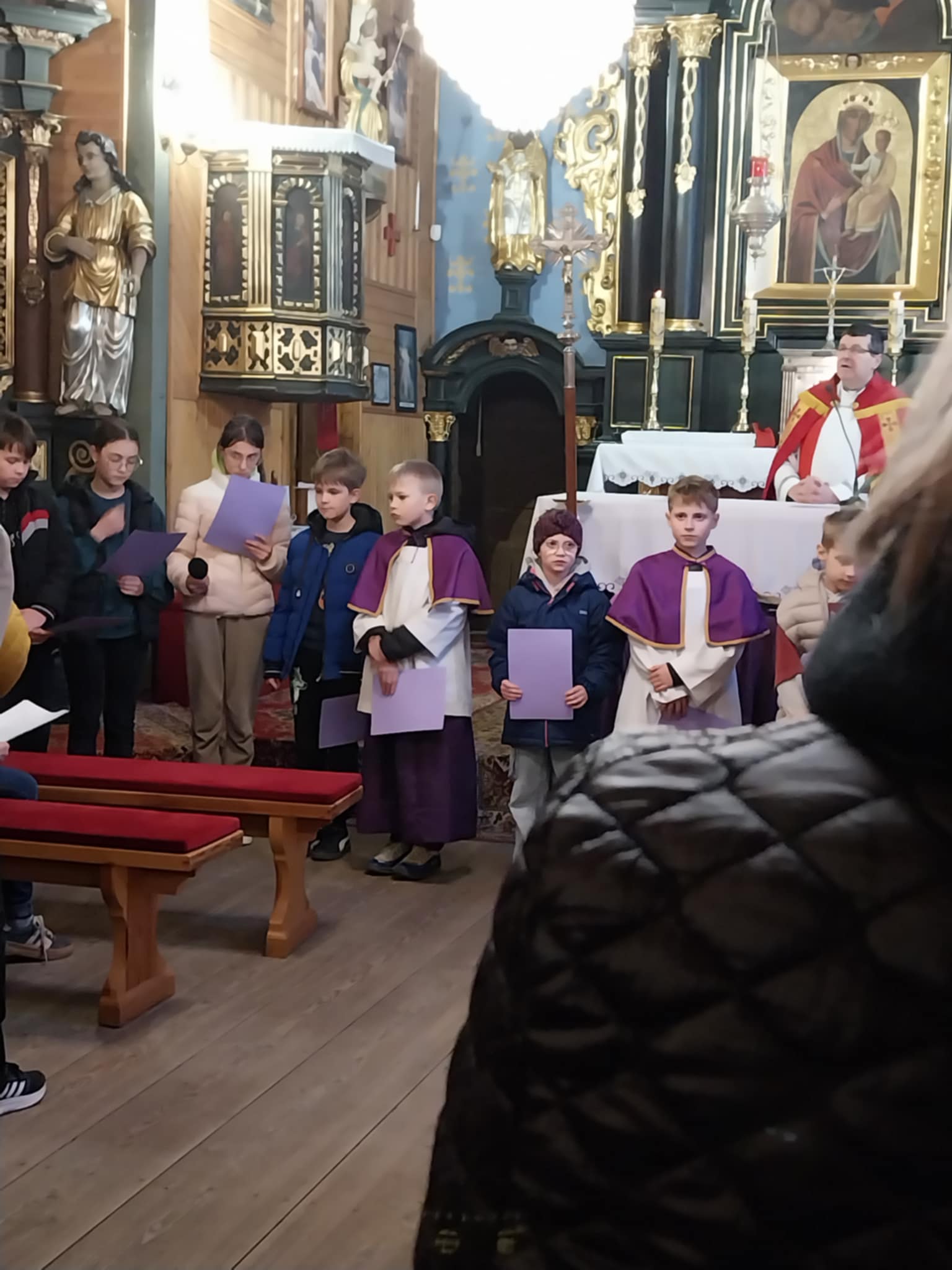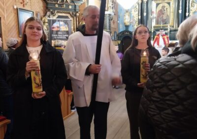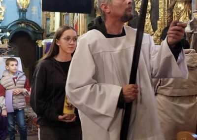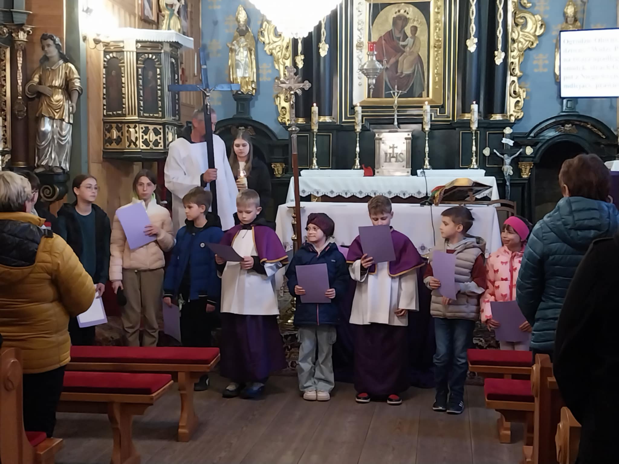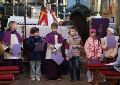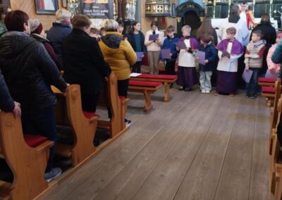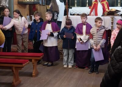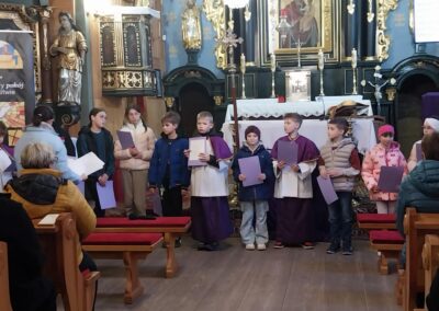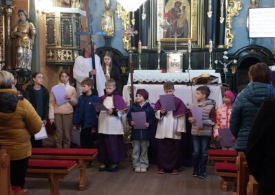 Po KGW Jarzębinki i KGW Ulinianki kolejna grupa mieszkańców poprowadziła nabożeństwo Drogi Krzyżowej w naszym kościele. 04 kwietnia 2025 r. najmłodsi parafianie podążali za Jezusem, towarzysząc mu w Jego Męce. Ministranci i lektorzy rozważali teksty przy poszczególnych stacjach Via Dolorosa. To niezwykle ważne, by od najwcześniejszych lat formować duchowo dzieci, by uczestnictwo w nabożeństwach traktowały nie jako przykry obowiązek, ale wspaniałą okazję do spotkania z Bogiem. Dziękuję Pani Dorocie Piechota za przygotowanie naszych milusińskich do sprawowania Drogi Krzyżowej.