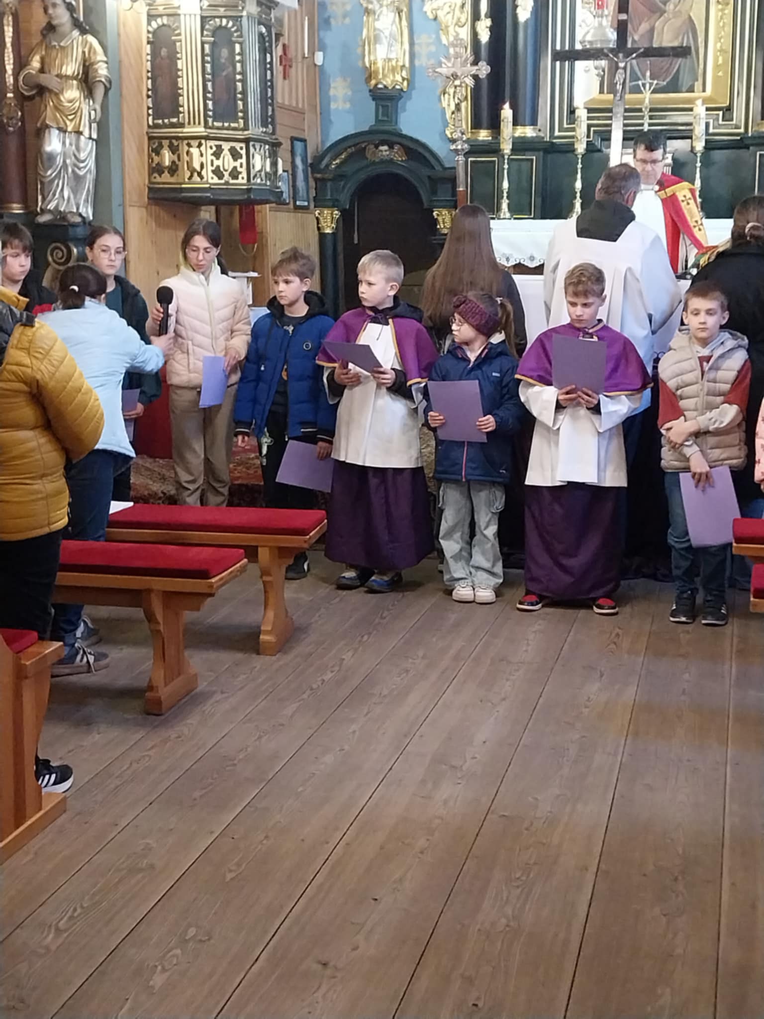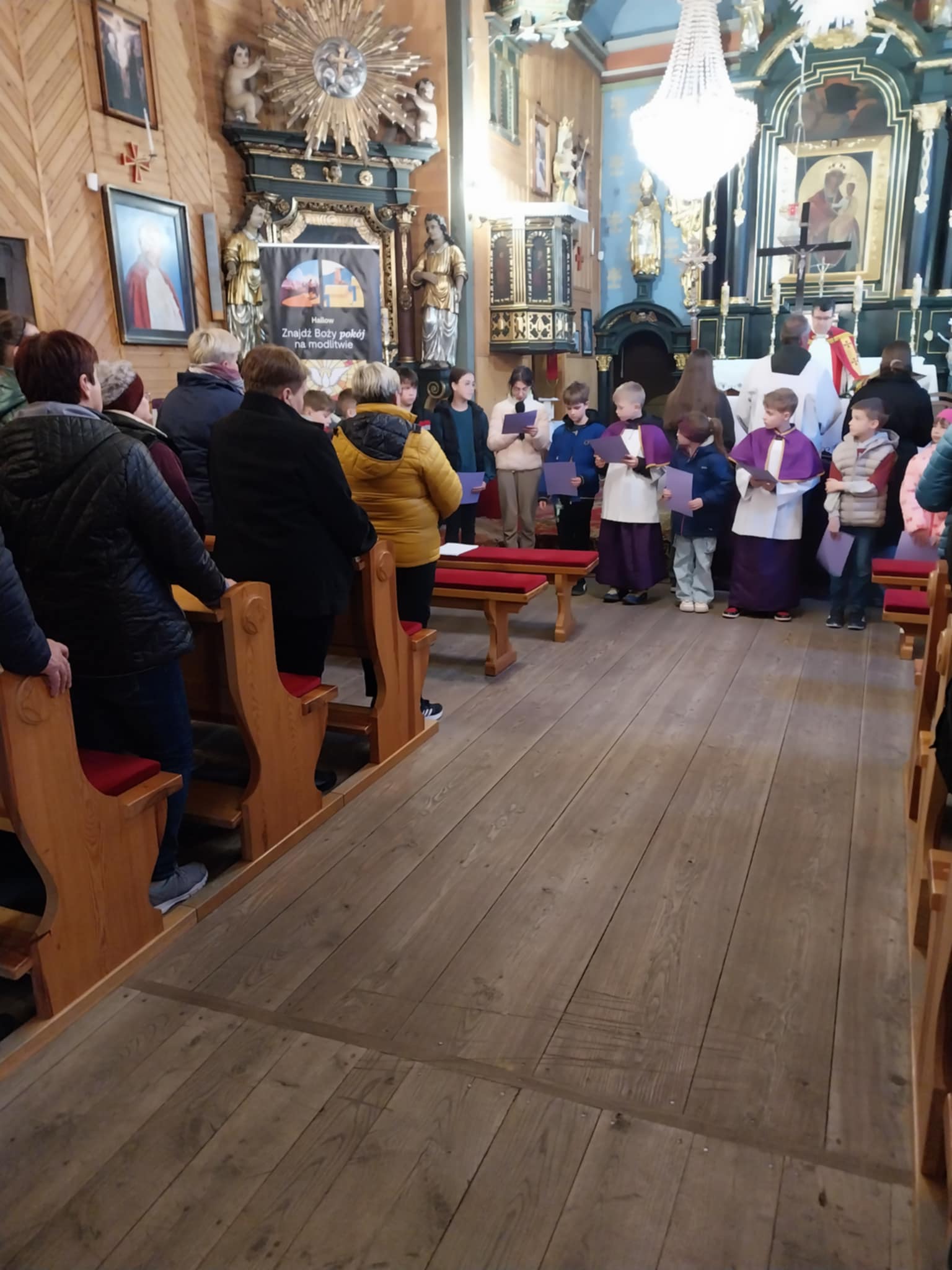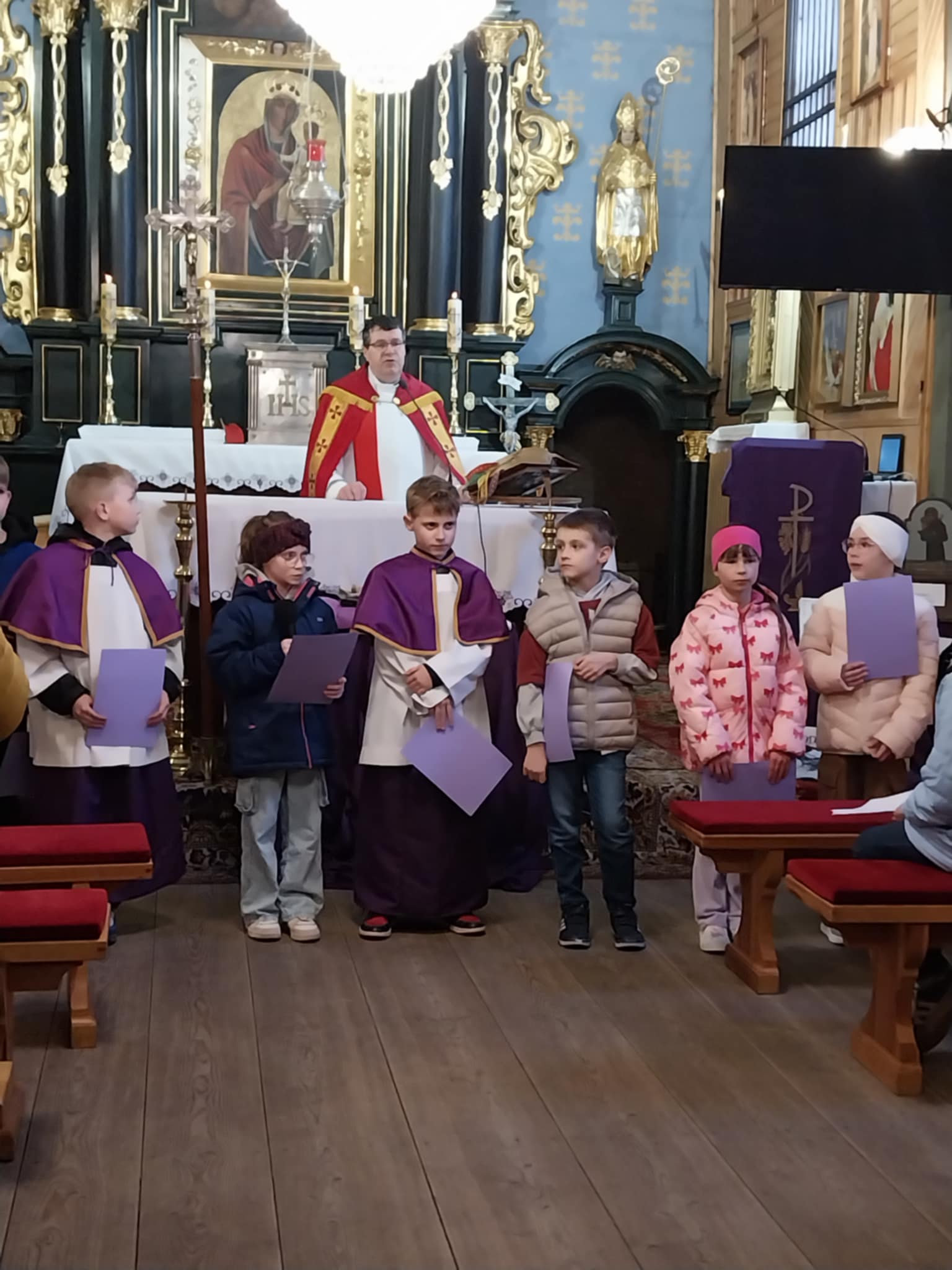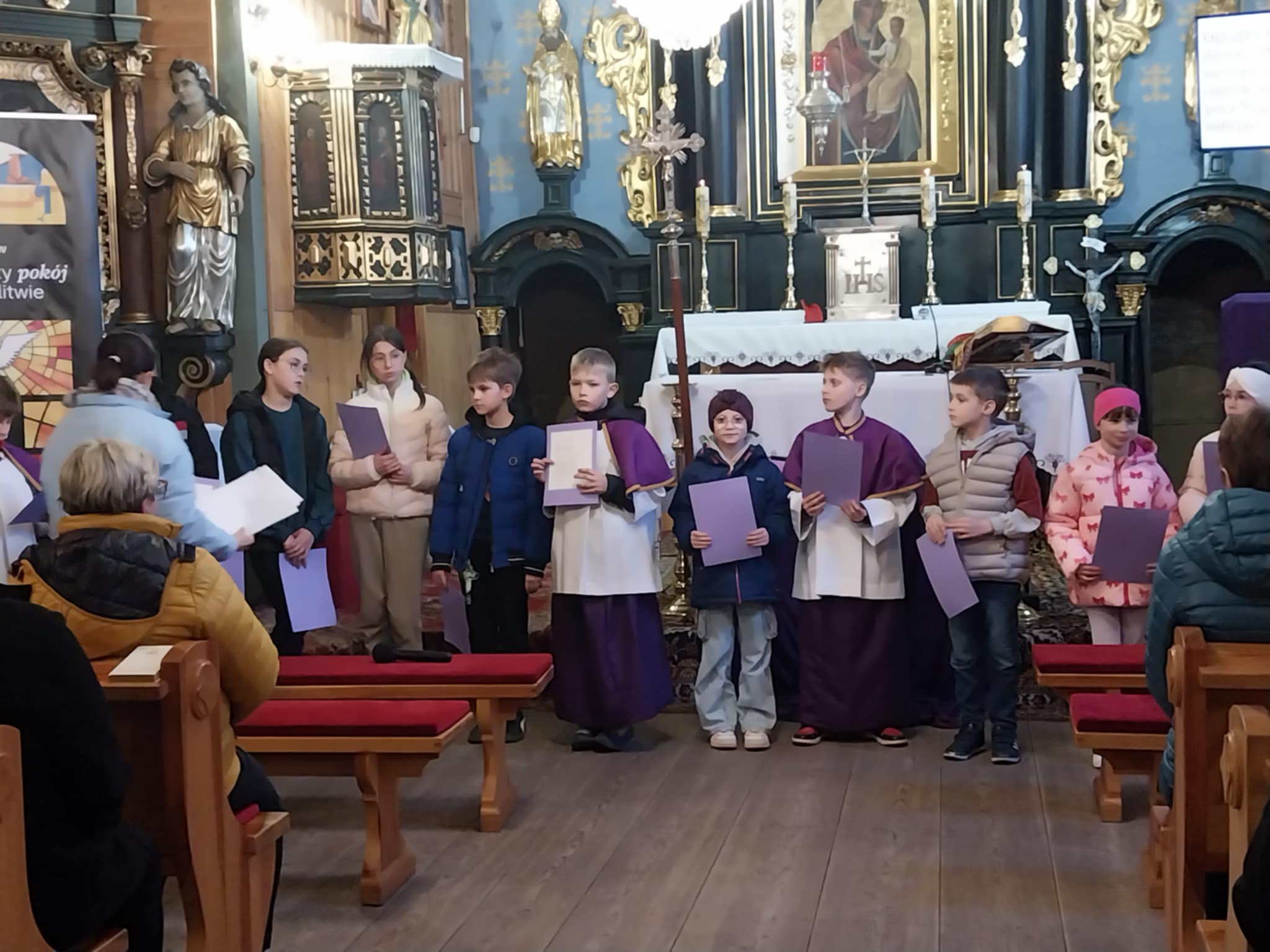 Po KGW Jarzębinki i KGW Ulinianki kolejna grupa mieszkańców poprowadziła nabożeństwo Drogi Krzyżowej w naszym kościele. 04 kwietnia 2025 r. najmłodsi parafianie podążali za Jezusem, towarzysząc mu w Jego Męce. Ministranci i lektorzy rozważali teksty przy poszczególnych stacjach Via Dolorosa. To niezwykle ważne, by od najwcześniejszych lat formować duchowo dzieci, by uczestnictwo w nabożeństwach traktowały nie jako przykry obowiązek, ale wspaniałą okazję do spotkania z Bogiem. Dziękuję Pani Dorocie Piechota za przygotowanie naszych milusińskich do sprawowania Drogi Krzyżowej.